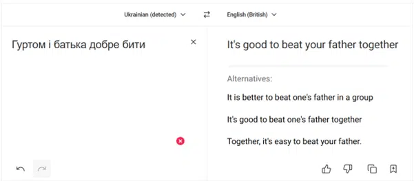 С переводом с украинского на другие языки тоже могут возникнуть курьезные ситуации. Вот как ИИ переводчик текста DeepL переведёт понятную каждому украинцу поговорку.